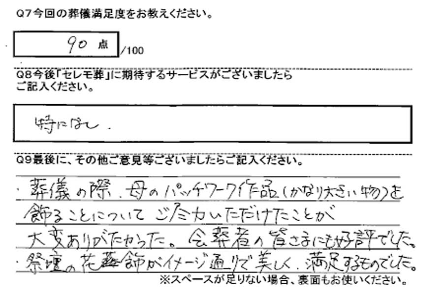 葬儀の際、母のパッチワーク作品(かなり大きい物)を飾ることについてご尽力いただけたことが大変ありがたかった。会葬者の皆さまにもご好評でした。祭壇の花飾がイメージ通りで美しく満足するものでした。