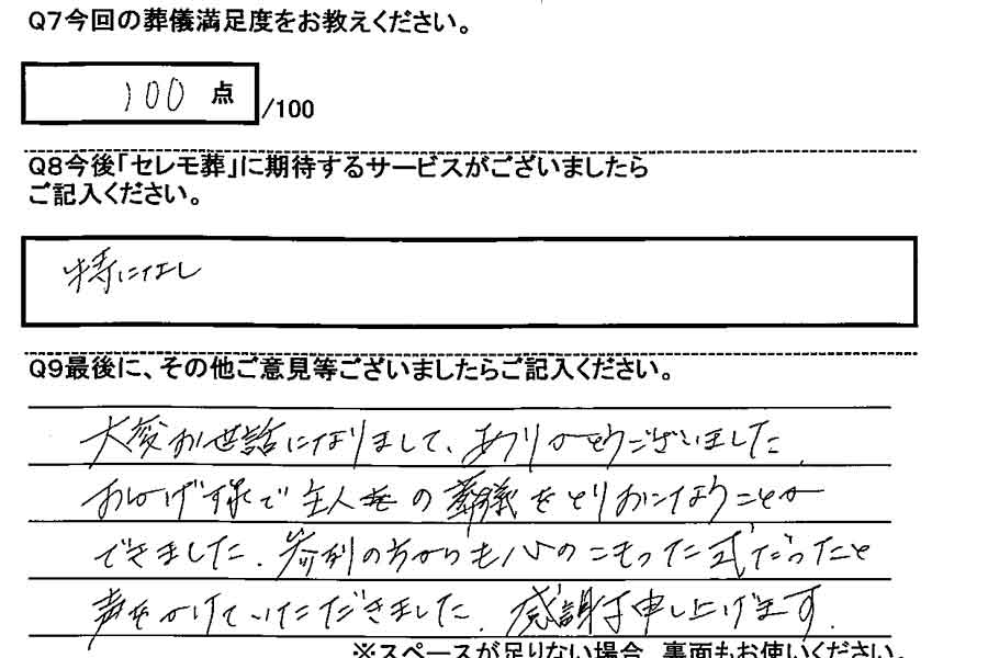 落合斎場でのセレモニーのお葬式「セレモ葬」N様のアンケート
